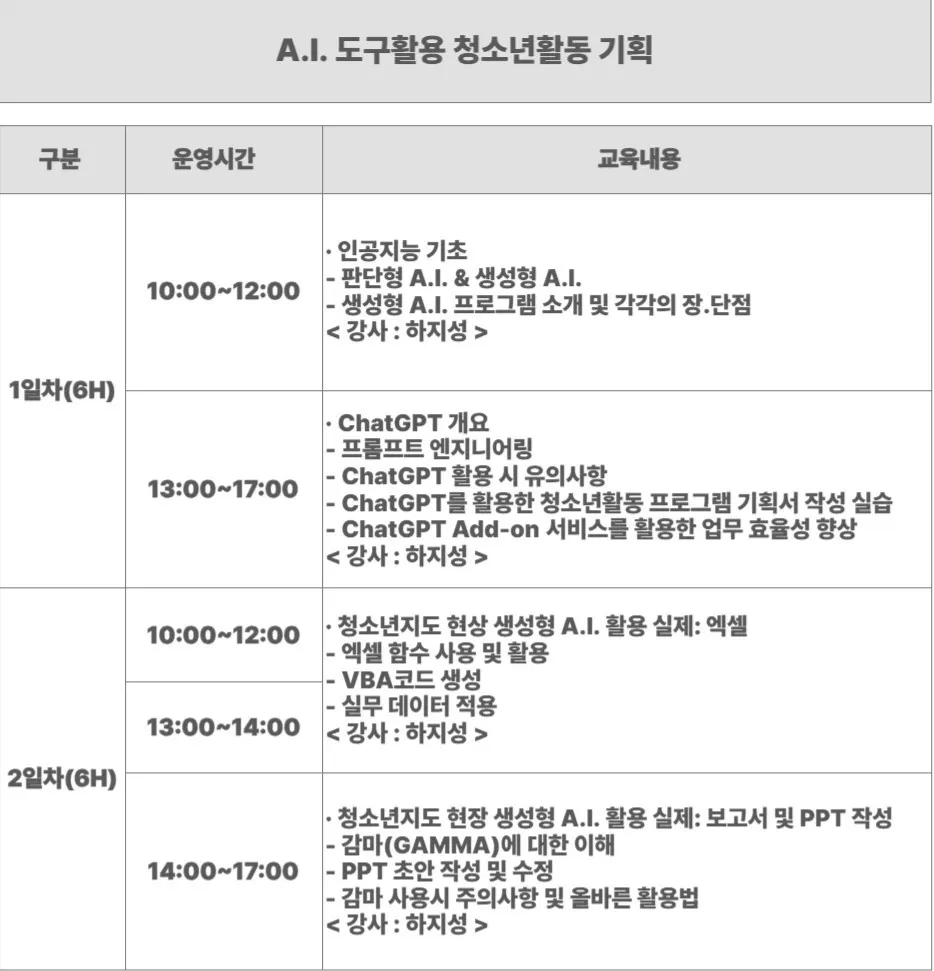 생성형 A.I. 도구의 기초 사용법을 습득하고 이들을 활용하여 청소년활동 프로그램 기획서를 작성할 수 있다.
