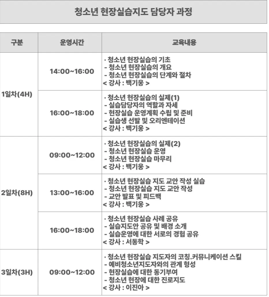 예비청소년지도인력의 역량 강화와 청소년지도자 인식 개선을 위한 효과적인 실습지도 방안을 학습한다.