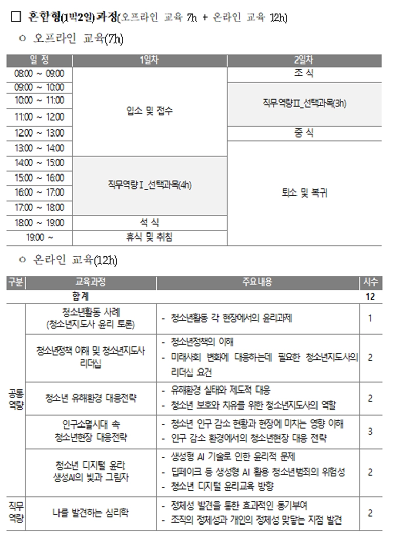 1. 집합교육 7시간 + 사후 온라인교육 12시간으로 구성된 과정입니다.