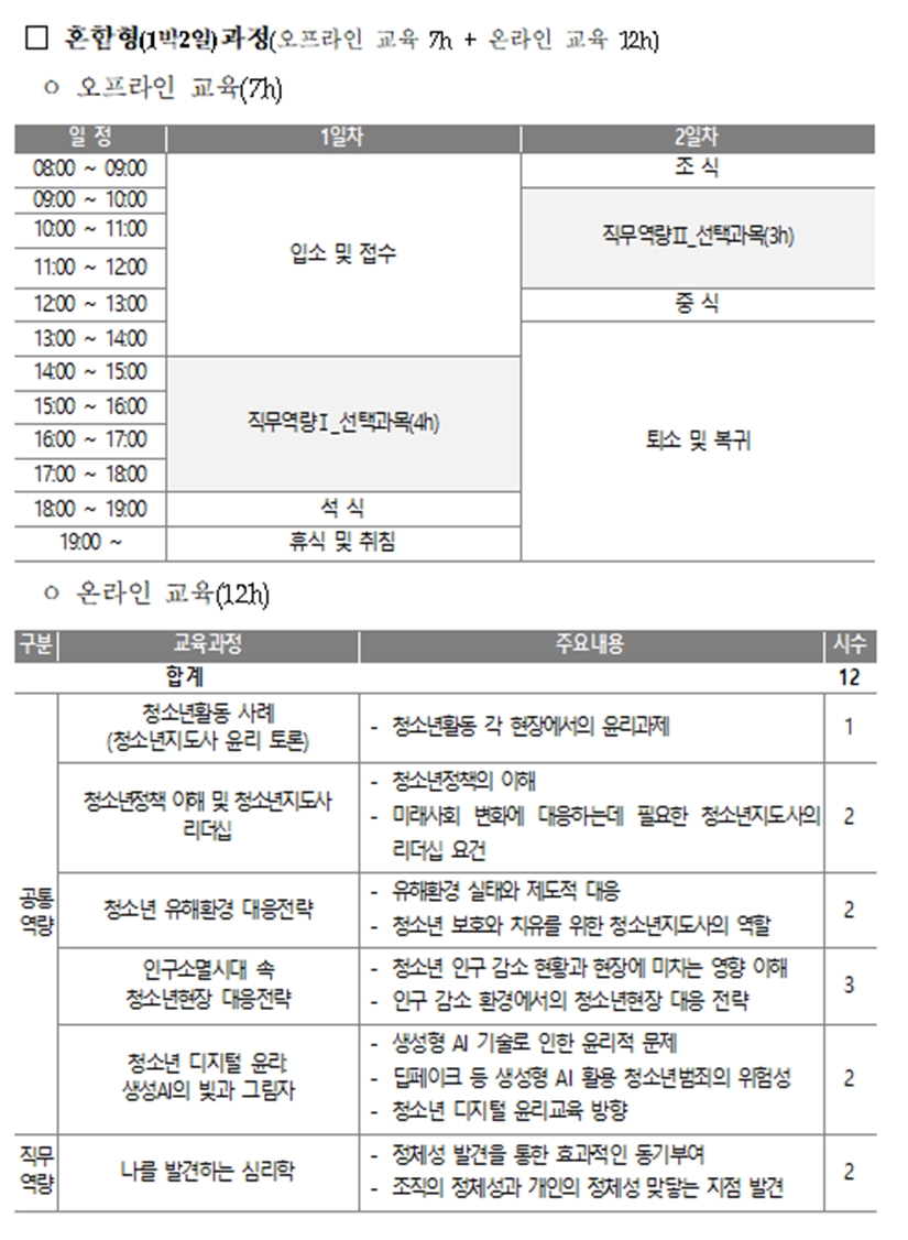 1. 집합교육 7시간 + 사후 온라인교육 12시간 으로 구성된 과정입니다.