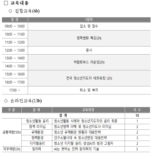 1. 집합교육 6시간 + 사후 온라인교육 13시간 으로 구성된 과정입니다.