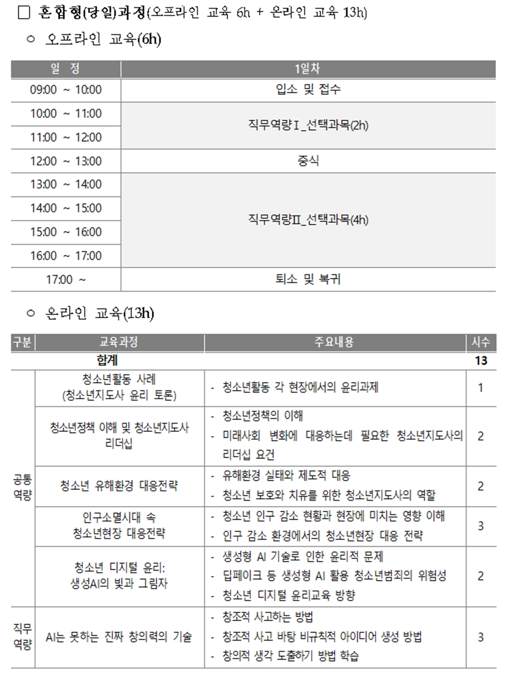 1. 집합교육 6시간 + 사후 온라인교육 13시간 으로 구성된 과정입니다.