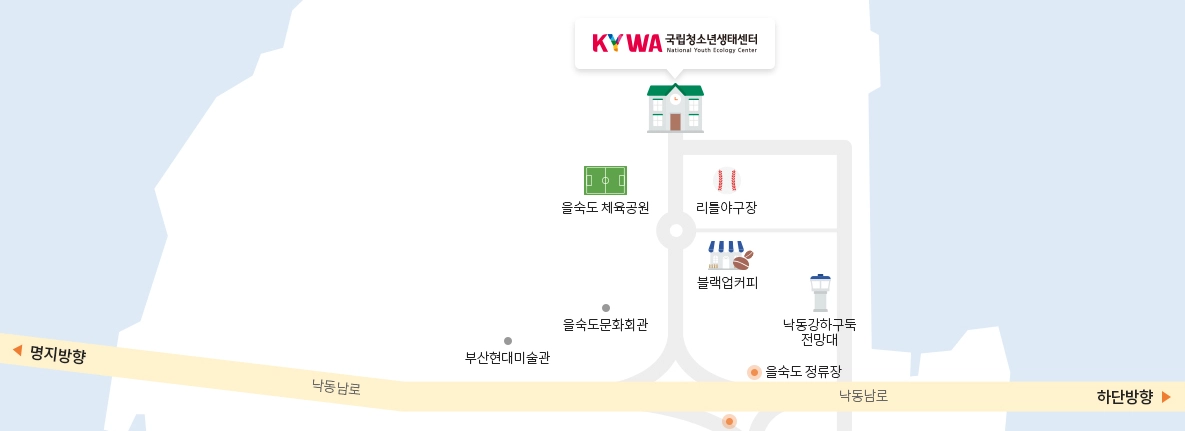내비게이션 → 공항로 명지IC 부산신항 거제, 창원 방면 → 국립청소년생태센터(낙동남로1233번길 43)