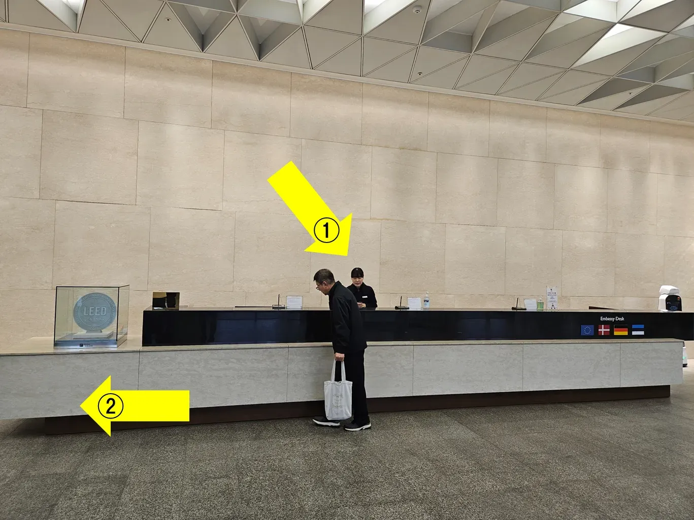2. 1층 프론트에서 방문증을 교환한 후, 왼쪽 길을 따라 프론트 뒷편으로 이동해주세요.